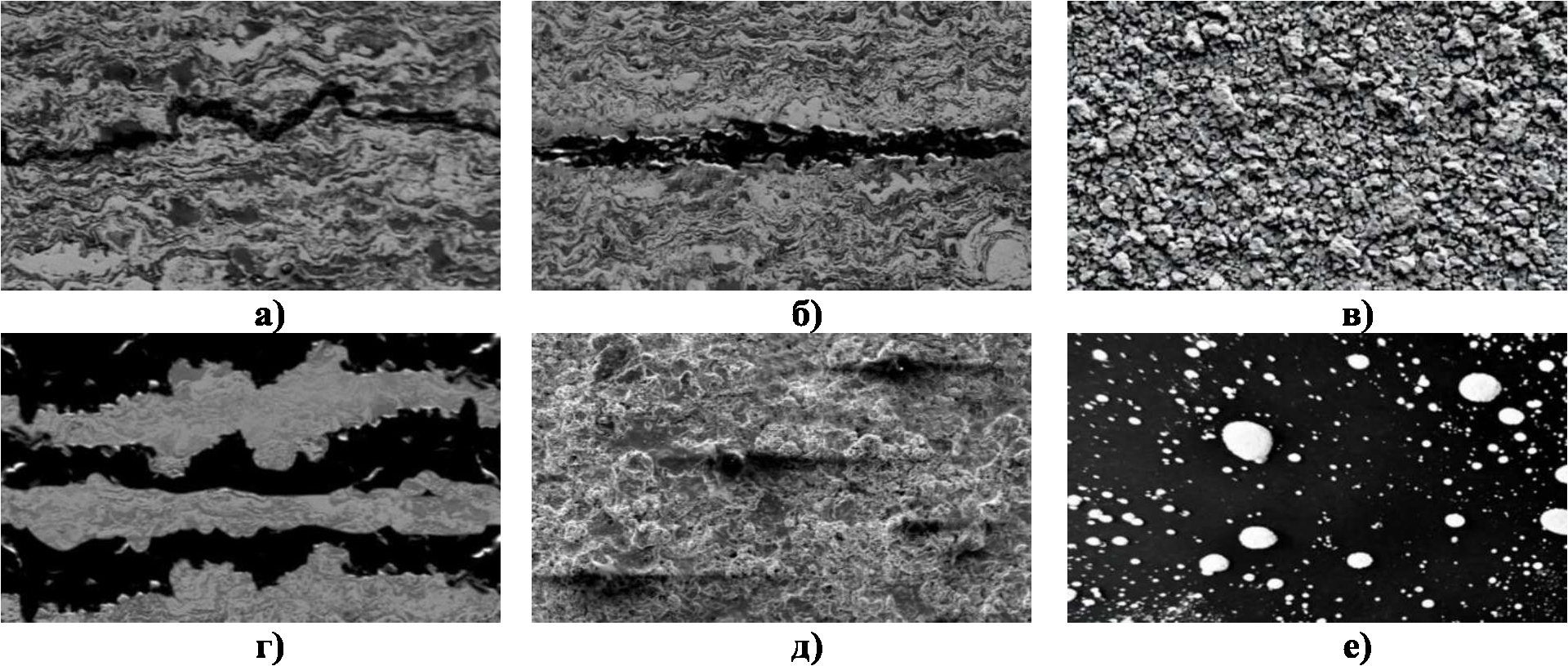 Рис. 1. Примеры распространенных дефектов композиционных покрытий:  а) трещины; б) отслоение; в) пористость; г) неравномерность толщины;  д) образование геля; е) контаминация