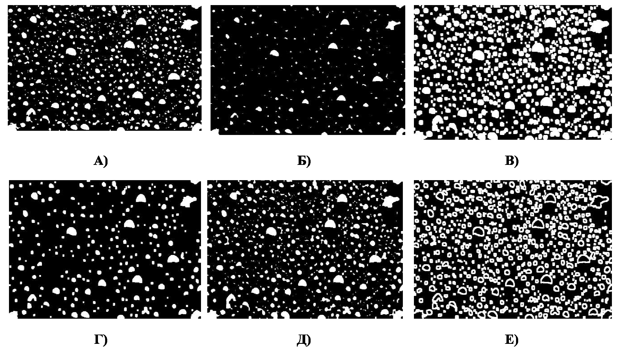 Fig. 6. А) The result of the binarization operation. Б) The result of the erosion operation.  В) The result of the dilation operation.  Г) The result of the opening operation. Д) The result of the closing operation.  Е) The result of applying a morphological gradient
