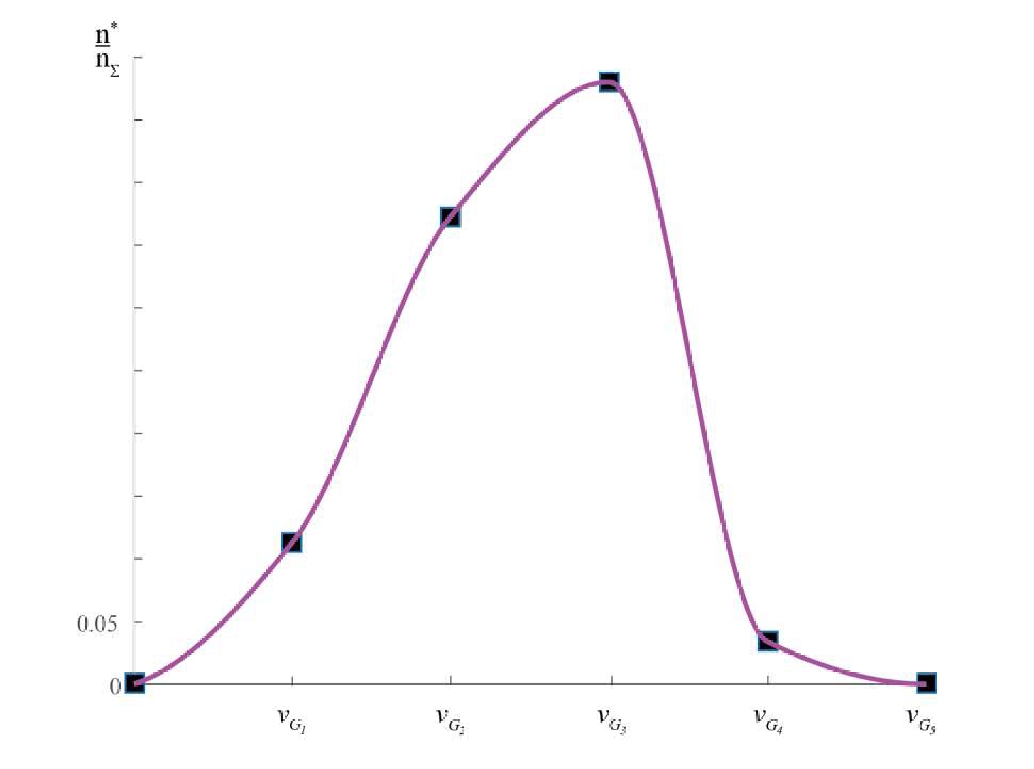 Рис. 10. Полигон частот распределения условных экстремумов фазовой скорости – топологическое описание облака точек рис. 9: n* ‒ число точек в i-м кольце, n∑ ‒ общее число точек в облаке