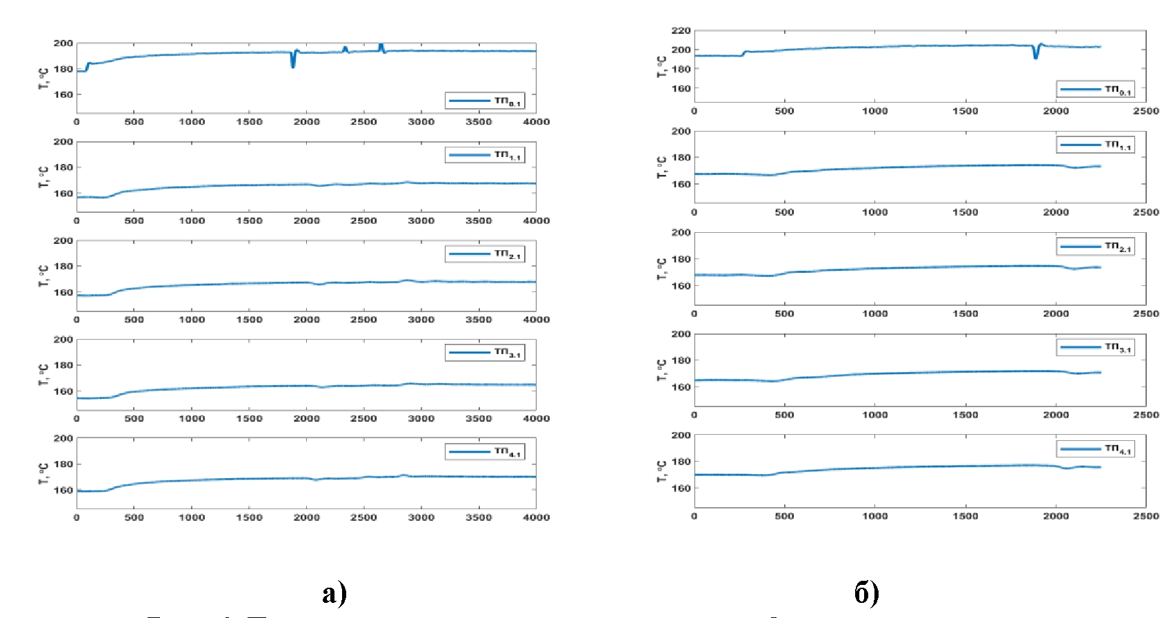 Основные эксперименты были проведены в двух- и четырехпетлевых режимах работы циркуляционного контура. Так, на рис. 3 показано изменение температуры на входе и выходе из источника тепла, при работе двух петель, энерговыделение составляло 1,8 кВт. После включения тепловыделения примерно 25 мин наблюдается колебательный процесс, связанный с формированием течения свинцово-висмутового теплоносителя, после чего работа контура стабилизируется. Поток теплоносителя разделяется после расширительного бака, проходит через теплообменники стока тепла и попадает в нисходящие линии. Температура в каждой нисходящей линии становится ниже, чем на выходе из источника тепла. Температуры в обеих нисходящих линиях практически одинаковы (рис. 3). При установившемся режиме естественной циркуляции температура на выходе из модели ТВС составляет 174 °C, на входах в источник тепла колеблется в диапазоне 152-154 °C (рис. 3б).
