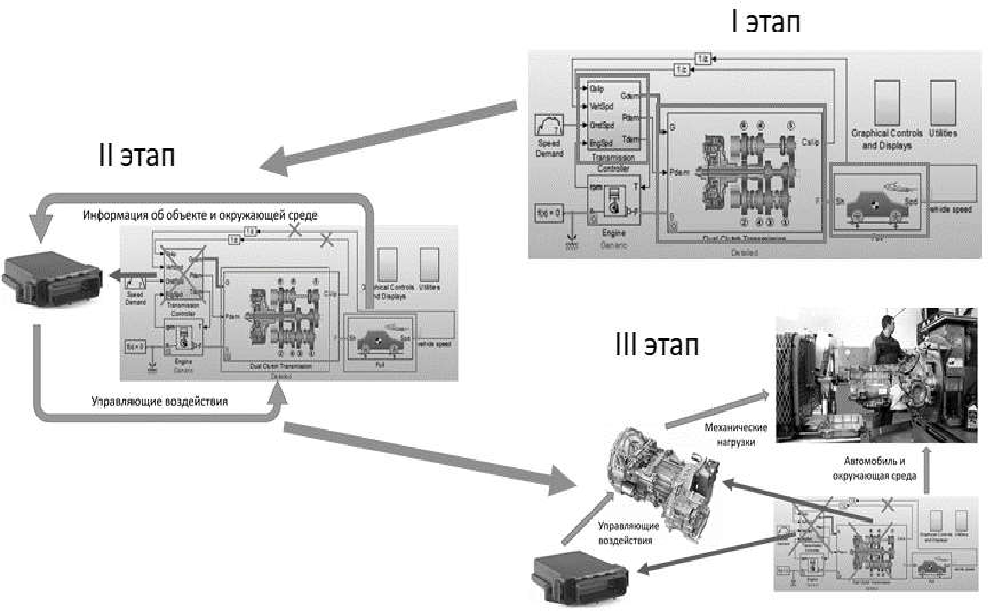 На третьем этапе разработки происходит тестирование систем транспортного средства, в котором может участвовать имитационная модель воздействий внешней среды.