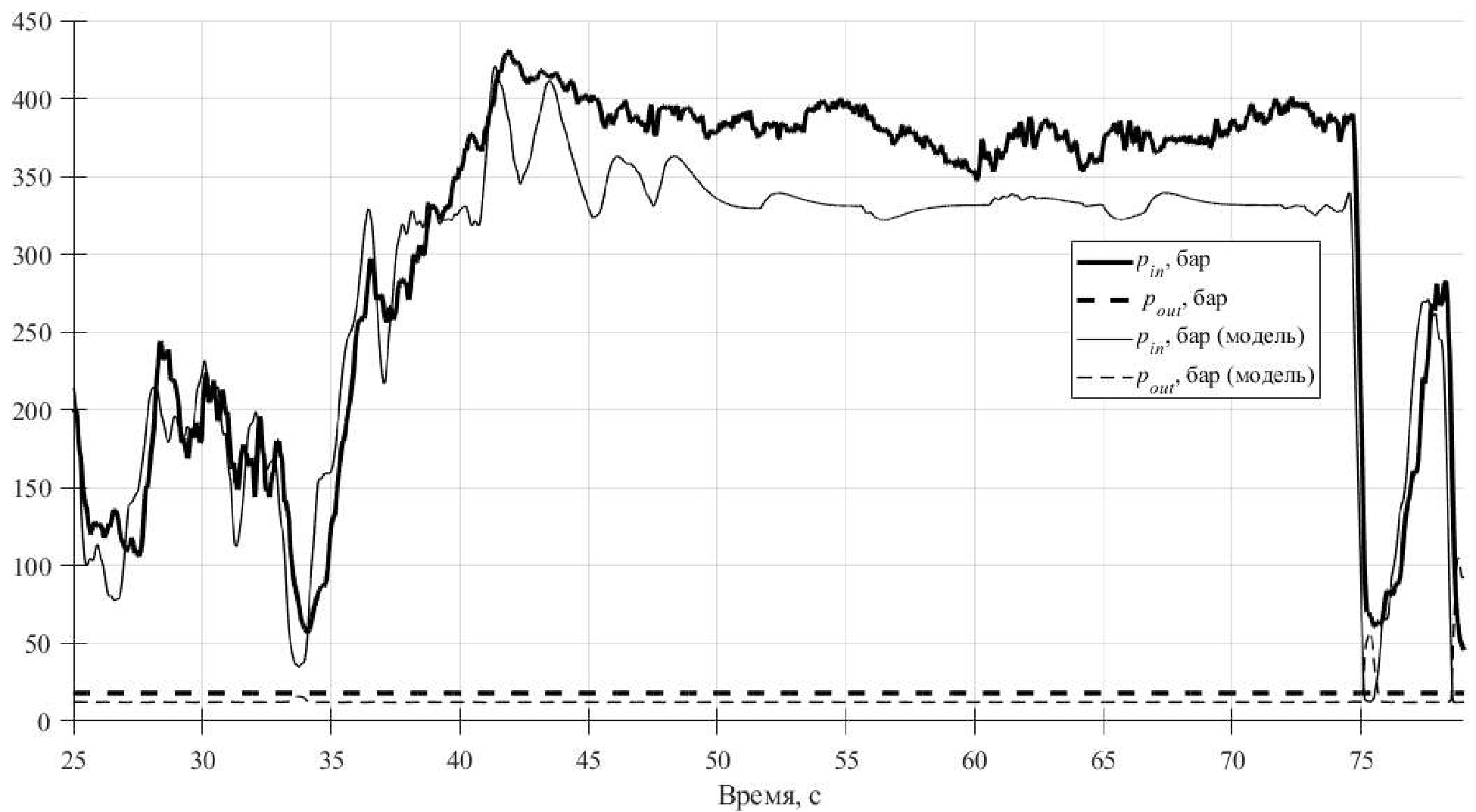 Сравнивая результаты эксперимента с результатами имитационного моделирования можно отметить, в первую очередь их качественное совпадение. Максимальное расхождение результатов наблюдается в значениях давления и составляет порядка 18%, при этом после первой итерации отладки алгоритмов на машине не составит труда учесть это отклонение.