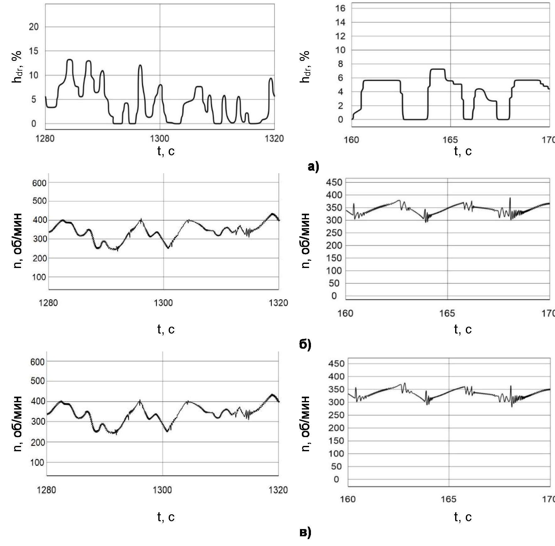 Рис. 5. Реализации положения педали хода и частот вращения роторов тяговых электродвигателей при S-образном характере зависимости уставок крутящего момента (слева ‒ фрагмент 1; справа – фрагмент 2): а) положение педали хода, %; б) частота вращения ротора левого электродвигателя, об/мин; в) частота вращения ротора правого электродвигателя, об/мин