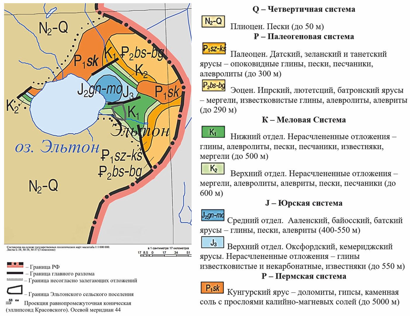 Рис. 1. Геологическая карта заволжской части Волгоградской области в районе Эльтонского сельского поселения [5]
