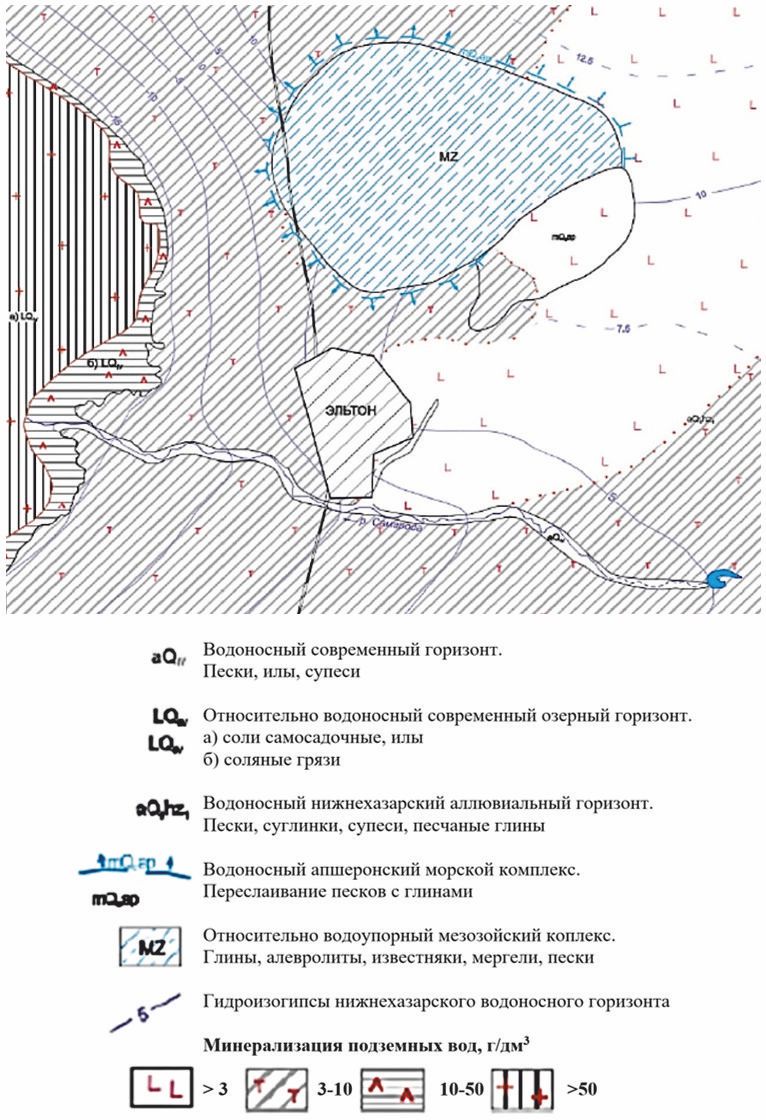 Подземные воды, залегающие здесь, относятся к хазарско-хвалынскому аллювиально-морскому водоносному горизонту. Почти повсеместно везде на территории Палласовского района основными проблемами эксплуатации этого горизонта являются: неглубокое залегание верхних водоносных слоев (3-7 м), а также слабая дренированность водовмещаемых пород (песков, супесей, суглинков, глин). В районе Эльтонского сельского поселения складывается иная ситуация – реки, впадающие в озеро Эльтон, хорошо дренируют хазарский горизонт, формируя депрессионную воронку. В результате чего уровень подземных вод опускается более чем на 20 м. Верхний хазарский комплекс высокоминерализован (5,8-5,9 г/л) и его воды непригодны для использования в хозяйственно-питьевых целях [5].