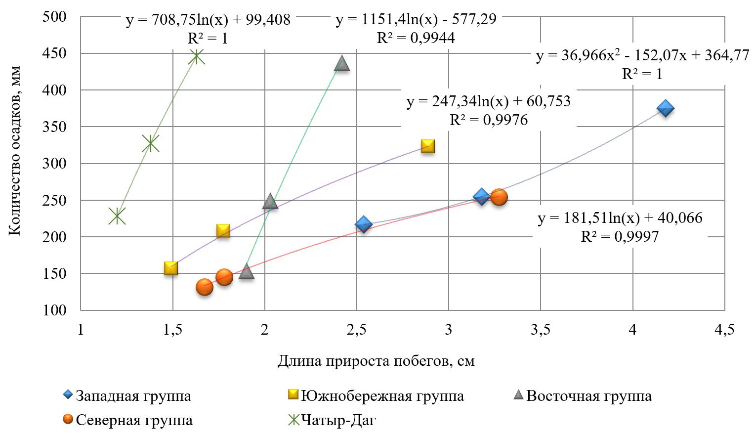 Для оценки влияния погодных условий на рост побегов, пробные площади были разделены на четыре географических группы: западную, южнобережную, восточную и северную. В отдельную группу вынесено дерево, произрастающее на нижнем плато г. Чатыр-Даг.