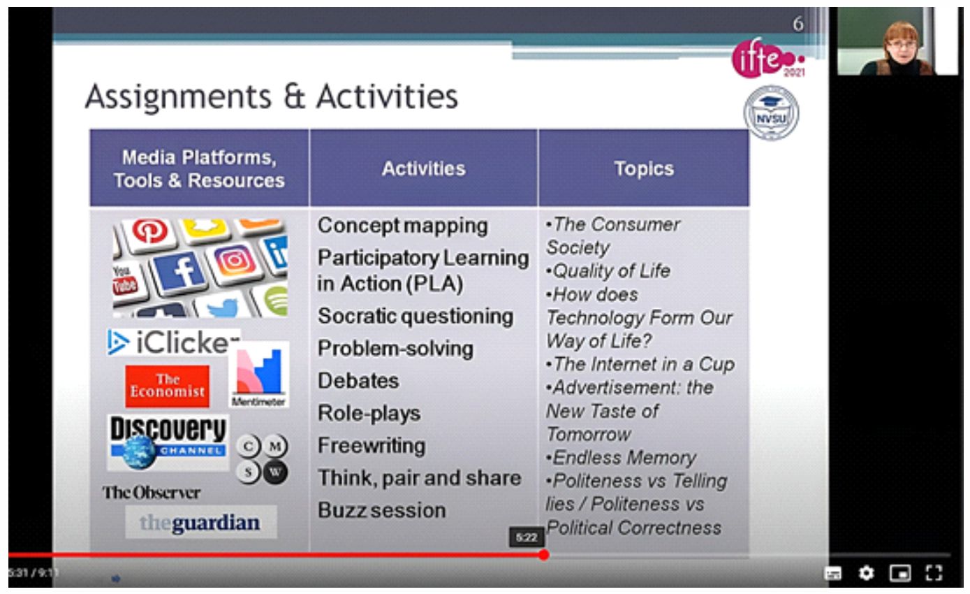 Figure 1 illustrates a 9 minute 11 second episode from Lecture 2 on the e-learning tools and resources for ESOL classes. In this part of the lecture the lecturer speaks about how the Internet resources (social media, e-journals, sci-pop websites) and tools (Mentimeter: https://www.mentimeter.com, iClicker: https://www.iclicker.com) can be used in classroom specifying the activities best to use. The lecture was video conferenced by the author via Zoom meetings (Zoom.com) during an online continuing education seminar on the digital tools and resources for ESOL and TESOL teaching in September 2022. Zoom meetings allows to deliver a lecture and record it simultaneously. The recording is stored in Zoom cloud or University LMS (http://do.nvsu.ru). To monitor comprehension in an online class, a teacher can divide students in pairs or small groups and assign them to Zoom rooms where they have to interact with one another to solve the problem, the teacher being able to visit every room and monitor the student progress. Other options for collecting immediate feedback or comprehension activities are described further.