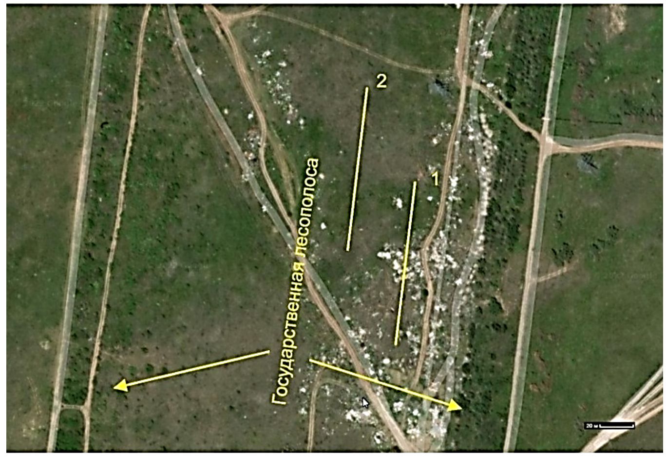 Несанкционированная свалка твердых бытовых отходов, расположенная на участке Государственной лесной полосы Камышин-Сталинград возле урочища Лысая Гора, представляет собой техногенный массив размещения отходов навалом, насыпью. В массиве свалочных масс, как известно, протекают процессы биохимического и химического разложения отходов, формирующие эмиссии загрязняющих веществ (в виде биогаза и фильтрата), оказывающих негативное воздействие на состояние окружающей среды [4]. Источником загрязнения атмосферного воздуха от свалки является биогаз, выделяющийся из тела полигона и образующийся в толще твёрдых бытовых отходов, размещенных на свалке. Под воздействием микрофлоры происходит биотермический анаэробный процесс распада органической составляющей отходов. Конечным продуктом этого процесса является биогаз, основную объёмную массу которого составляют метан и диоксид углерода. Возникает угроза пожароопасности, а также происходит загрязнение окружающей среды [5]. Размеры полосы отчуждения вдоль несанкционированных свалок законодательно не указаны, поэтому за величину было принято H расстояние, равное 30 м от границы свалки.