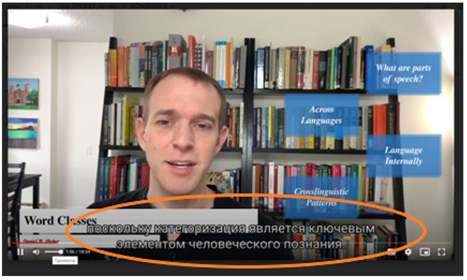 As a result of the project the students created a Russia subtitled voice-over version of the English video lecture “Language Typology. Word Classes” (https://clck.ru/34ZUub). Pic. 2 illustrates the resulting version of the video lecture.