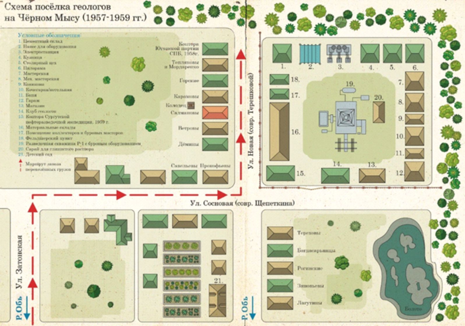 Всё необходимое на первое время нефтеразведчики привезли с собой на баржах из села Ивановка: оборудование, разобранные дома, тракторы, автомобиль, снаряжение [22, с. 69]. В границах современных улиц Терешковой и Щепеткина (в конце 1950-х годов это улицы Новая и Сосновая) началось формирование первого посёлка геологоразведчиков и их производственной базы (рис. 1). Сейчас на месте бывшего посёлка, на улице Терешковой д. 49, располагается Мемориальный комплекс геологов-первопроходцев «Дом Ф.К. Салманова». Дом, в котором проживал Ф.К. Салманова, построенный в конце 1957 года, сохранился до настоящего времени. В 2013 году он был признан объектом культурного наследия регионального значения.