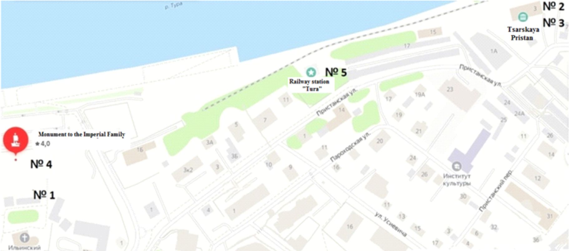 The diagram of commemorative signs dedicated to the family of the former Emperor Nicholas II (No. 1 – memorial sign “Tsarskaya Pristan”, No. 2 – iron worship cross, No. 3 – marble worship cross, No. 4 – monument) and the railway station “Tura” (No. 5) on the map of Tyumen [35]