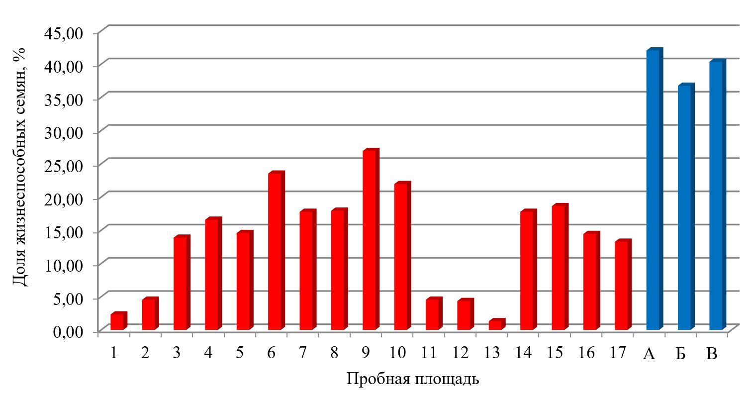 Рис. 3. Доля жизнеспособных семян J. deltoides в пределах пробных площадей (красный цвет – древостои; синий – редины)