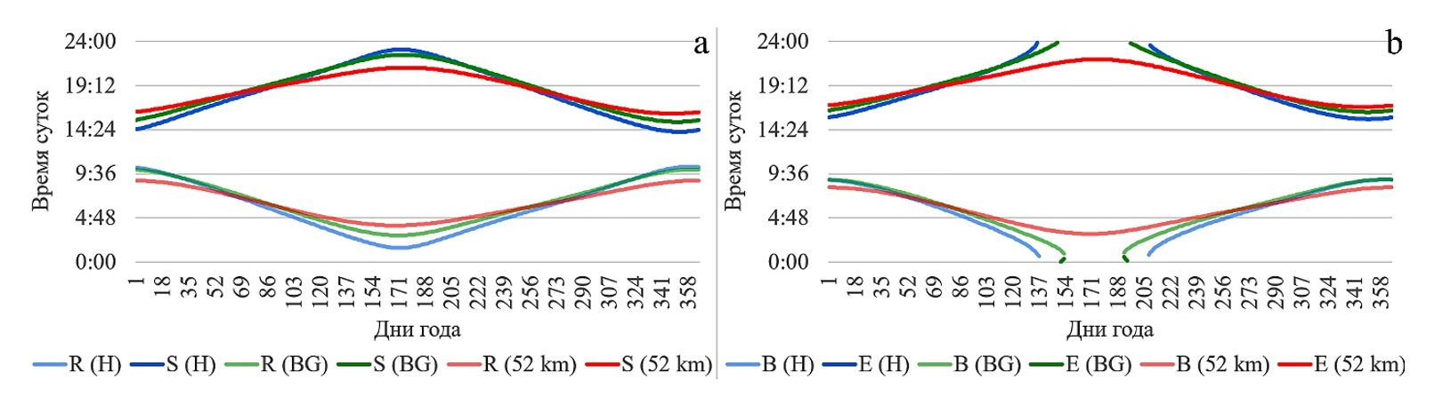 Рис. 4. Время восхода и захода солнца (a), продолжительность гражданских сумерек (b) на участках обнаружения обыкновенного светляка по северной границе ареала, 2022 г. (данные https://clck.ru/35hmEo). Обозначения: R – восход; S – заход; B – начало; E – конец; H – окрестности д. Хартаанселькя, центральная Финляндия (https://clck.ru/35hmAy); BG – стационар «Белая Гора» заповедника «Малая Сосьва», западная часть ХМАО – Югры (А.Р. Артющенко – личное сообщение); 52 km – кордон «52 км» государственного природного заповедника «Зейский», северная часть Амурской области [17]