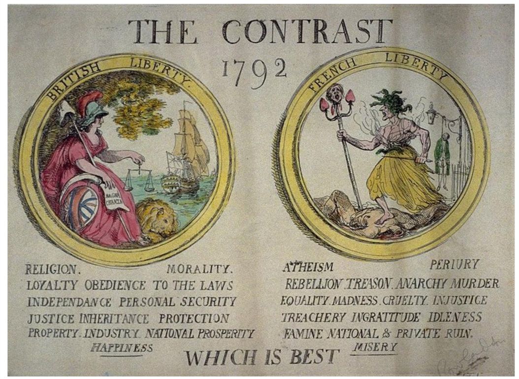 Однако стоит отметить, что в своих попытках противопоставить родную страну противнику за Ла-Маншем, Гилрей был не одинок. Так, двухчастная карикатура Томаса Роулендсона «Контраст 1792 – Что лучше», демонстрирует схожую концепцию контраста «британской свободы» и «французской свободы» (рис. 4) [18]. Слева: Британия, в ногах которой находится лев, держащий «Великую хартию вольностей». Надпись под изображением отражает главные принципы страны: «Религия, нравственность, верность, подчинение законам, независимость, личная безопасность, справедливость, наследство, защита, собственность, промышленность, национальное процветание, СЧАСТЬЕ». Справа: тощее уродливое и плохо одетое олицетворение Франции, которая подобна Медузе Горгоне со змеями вместо волос. Насадив на пику чью-то отрубленную голову, Франция топчет обезглавленный труп на фоне человека, повешенного на фонарном столбе. Под этим изображением надпись: «Атеизм, Лжесвидетельство, Восстание, Измена, Анархия, Убийство, Равенство, Безумие, Жестокость, Несправедливость, Предательство, Неблагодарность, Праздность, Голод, Национальное и Частное Разрушение, СТРАДАНИЕ». Внизу карикатуры большим шрифтом общий вопрос: «Что лучше?».