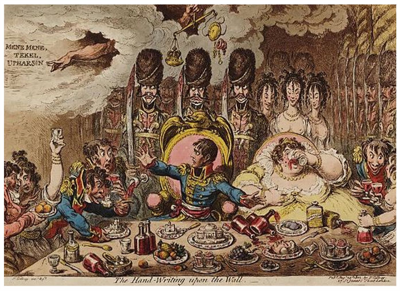 - James Gillray. The handwriting upon the wall, 24 August 1803. https://clck.ru/38aSEX