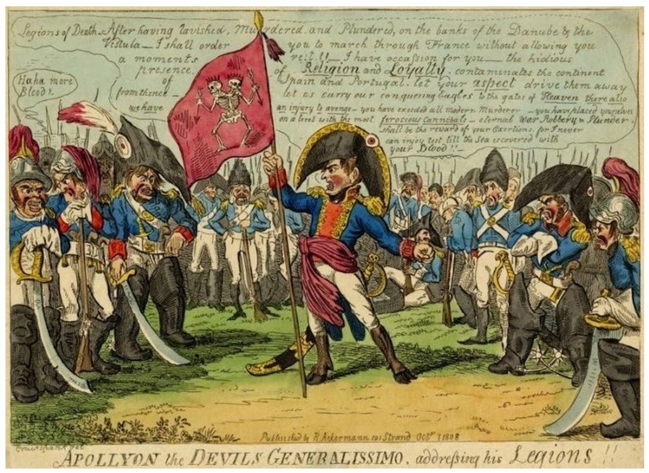 Дж. Крукшенк, ученик Гилрея, продолжил его сатирическую традицию, и посвятил большинство своих гравюр эпохе наполеоновских войн. В карикатуре «Аполлион, генералиссимус дьяволов, обращается к своим легионам!» представлен Наполеон, произносящий пламенную речь о своих успехах на берегах Дуная и Вислы (рис. 7) [10]. В своей речи он призывает свои «легионы смерти» пройти маршем через всю Францию, не отдыхая ни минуты, для освобождения территории Испании и Португалии от религиозного влияния. Наполеон как всегда хвастлив, слишком амбициозен. Не отстают от него и солдаты, которые внимательно слушают его с агрессивными гримасами. В данной карикатуре ярко показан образ «врага» не только в лице Наполеона, но и в представителях Великой армии. «Легионы смерти», несмотря на разнородность своего состава, изображены одинаково отталкивающими.