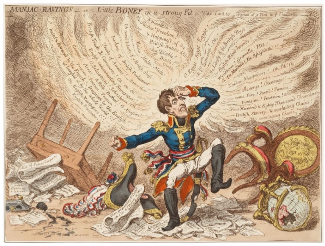 В дальнейшем особое место в английской политической карикатуре было отведено событиям эпохи наполеоновских войн, когда борьба между Францией и Великобританией начала носить характер открытого противостояния. Большинство карикатур Дж. Гилрея было сосредоточено на образе Наполеона, который стал персонификацией образа «врага». В действиях французского императора карикатуристы видели несомненную опасность – и для Великобритании, в первую очередь, и для мира в целом. Именно поэтому было важно доступно и наглядно отразить это в сатире.