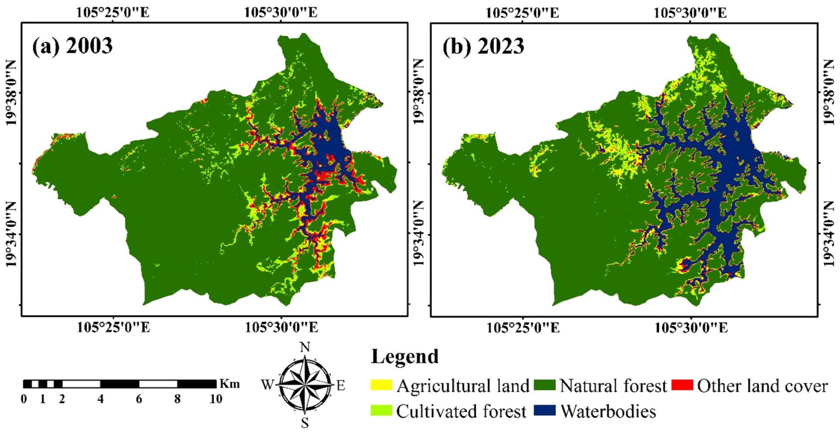 The classification results have indicated that in 2003, the natural forest class area was the largest area within the research area, accounting for 83.09% (12243.22 ha) (Table 1). Following that, the waterbodies class area accounted for 5.62% (827.95 ha), the cultivated forest class area accounted for 5.24% (772.79 ha), and other land cover classes area accounted for 4.08% (601.79 ha). Lastly, the agricultural land class area had the smallest coverage within the research area at 1.96% (289.25 ha) (Table 1). By the year 2023, the natural forest class area had experienced a reduction in coverage; however, it remained the predominant land cover class within the research area, accounting for 75.00% (11050.80 ha). Furthermore, the cultivated forest and other land cover classes area had also decreased to 5.14% (758.02 ha) and 2.63% (387.24 ha), respectively (Table 1). Meanwhile, the area of agricultural land and waterbodies classes had increased to 3.62% (532.85 ha) and 13.61% (2006.09 ha), respectively of the total research area.