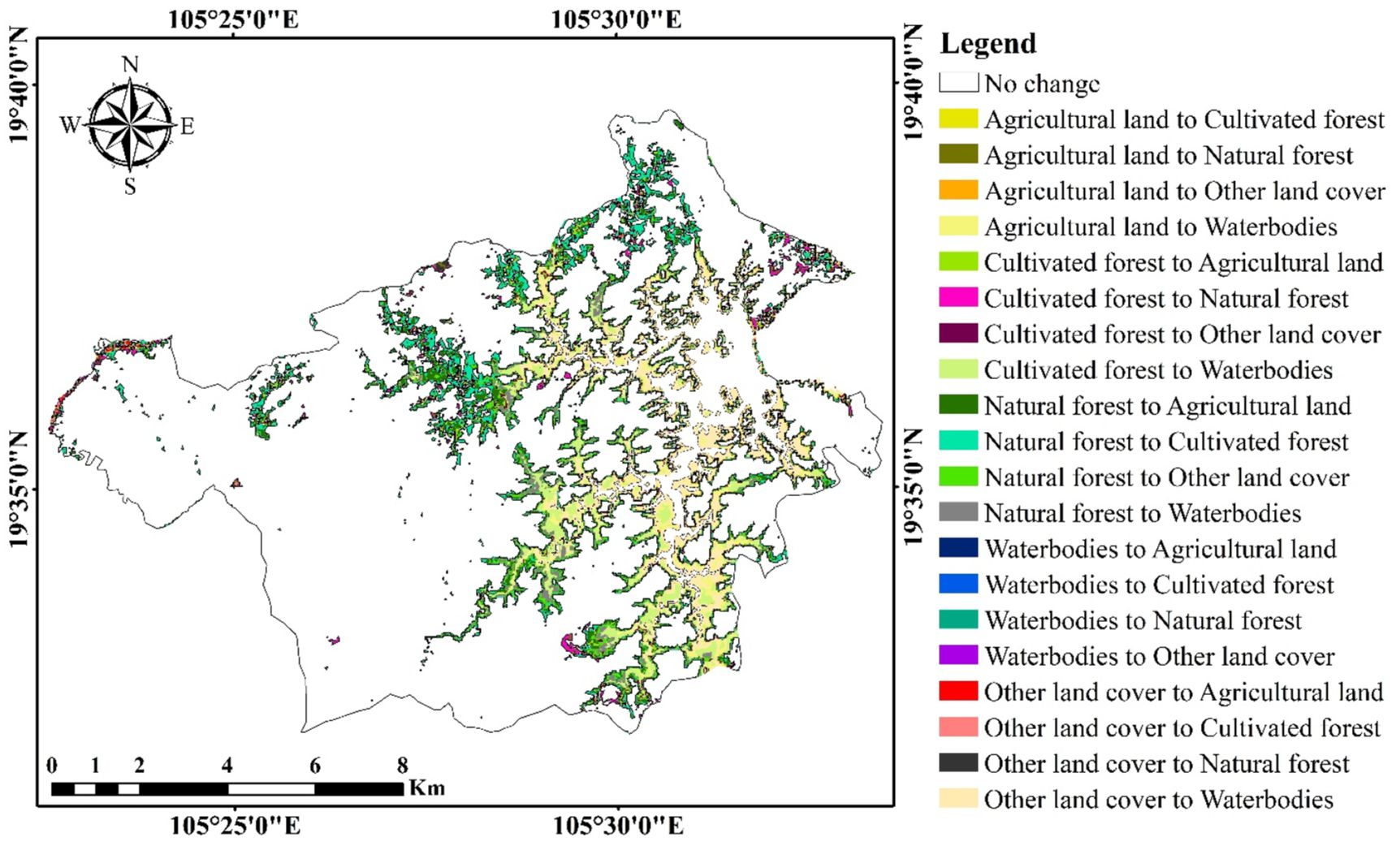 Figure 3 illustrates the changes in land cover classes within the Ben En National Park from 2003 to 2023. From Table 1, it can be observed that, during this period, most of the LULC changes occurred in the natural forest and waterbodies classes. The area of the waterbodies class has increased the most, with a total area increase of 1178.14 ha (8.00%). This significant increase in waterbodies may be due to natural processes like increased rainfall or changes in hydrological patterns [25; 28]. It could also result from human activities such as dam construction or irrigation projects, which may have led to the creation of new water bodies or the expansion of existing ones. In addition, the area of agricultural land class has also increased by 243.60 ha, equivalent to 1.65% of the total area of the study area. The expansion of agricultural land can be linked to factors like population growth, agricultural development, or changes in land-use policies [24]. Conversion of natural areas, including forests, into agricultural land is a common reason for such increases. In contrast, the natural forest area class has been reduced the most with 1192.42 ha (8.09%), along with other land cover classes also reduced with 214.55 ha (1.46%) (Table 1). The substantial reduction in natural forest area may be primarily due to deforestation, logging, and land conversion for agricultural or developmental purposes [8]. Human activities, illegal logging, and forest clearance for infrastructure or agricultural expansion are typical causes of deforestation. Finally, the cultivated forest class from 2003 to 2023 has also been reduced by 14.77 ha (0.10%) (Table 1). The reduction in cultivated forest may be due to factors like shifting agricultural practices, abandonment of cultivated areas, or changes in land management [5]. These factors can lead to a decrease in the extent of cultivated forest over time.