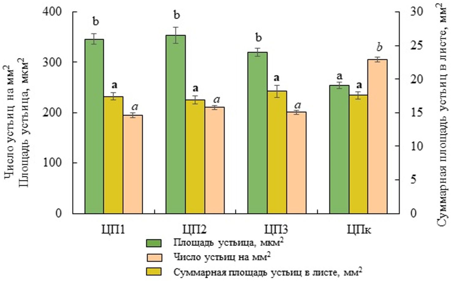 Рис. 1. Параметры устьиц листа Ch. umbellata из изученных ценопопуляций, произрастающих на Среднем Урале. Разные буквы указывают на достоверные различия площади устьиц (a, b), числа устьиц (а, b) между исследованными ЦП; одинаковая буква (a) по показателю суммарной площади устьиц во всех ЦП обозначает отсутствие достоверных отличий по этому показателю между исследованными ЦП при уровне значимости p˂0,05