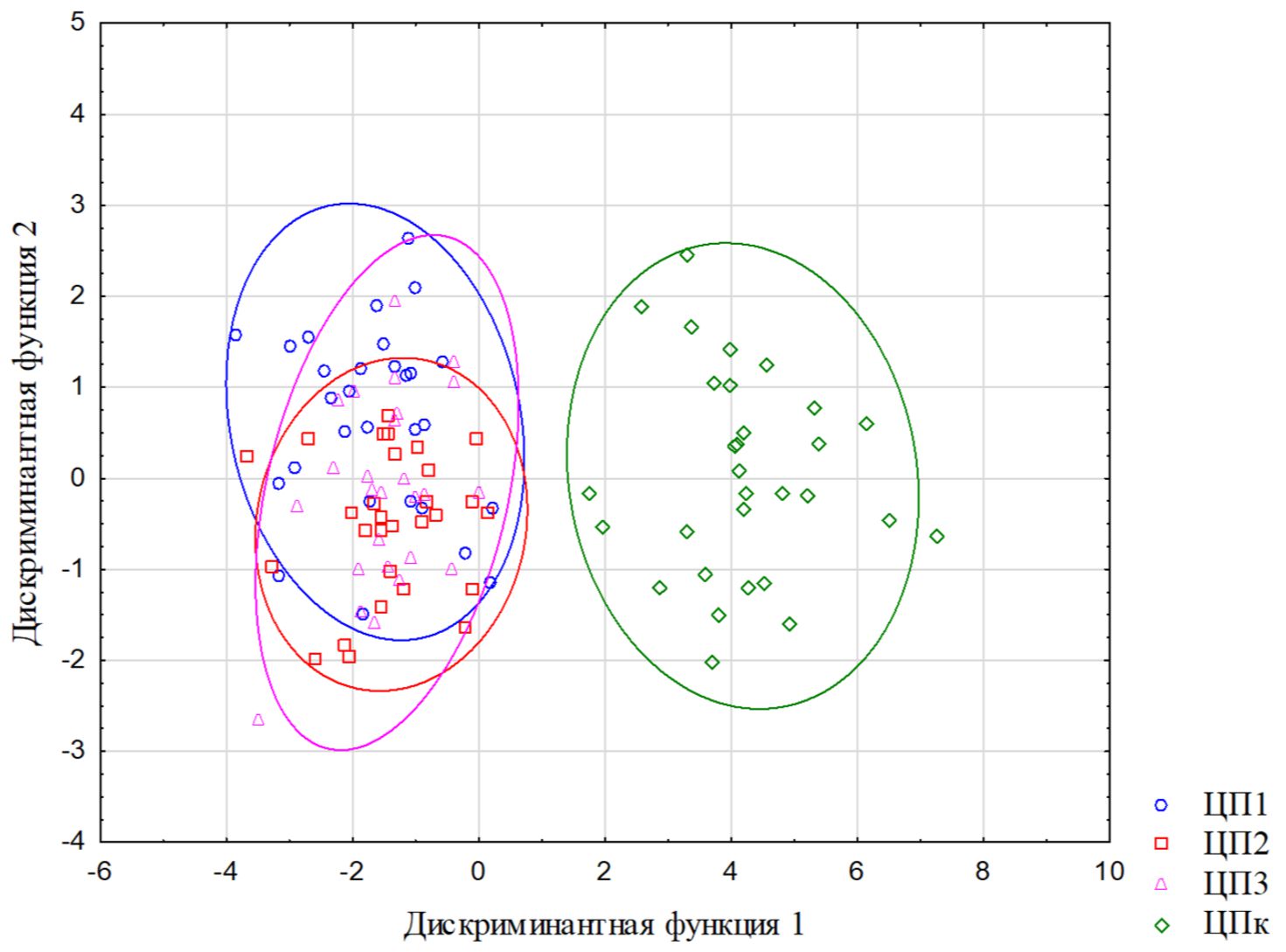 Дискриминантный анализ, проведенный с использованием таких анатомических признаков, как число устьиц на единицу площади, средняя площадь устьица, толщина листа, толщина мезофилла, толщина губчатой паренхимы, отделил ЦПк от ЦП1–ЦП3 по дискриминантной функции 1 (рис. 2). Корректность отнесения в группы составляла: ЦПк – 100%, ЦП1 – 60%, ЦП2 – 45%, ЦП3 – 50%.