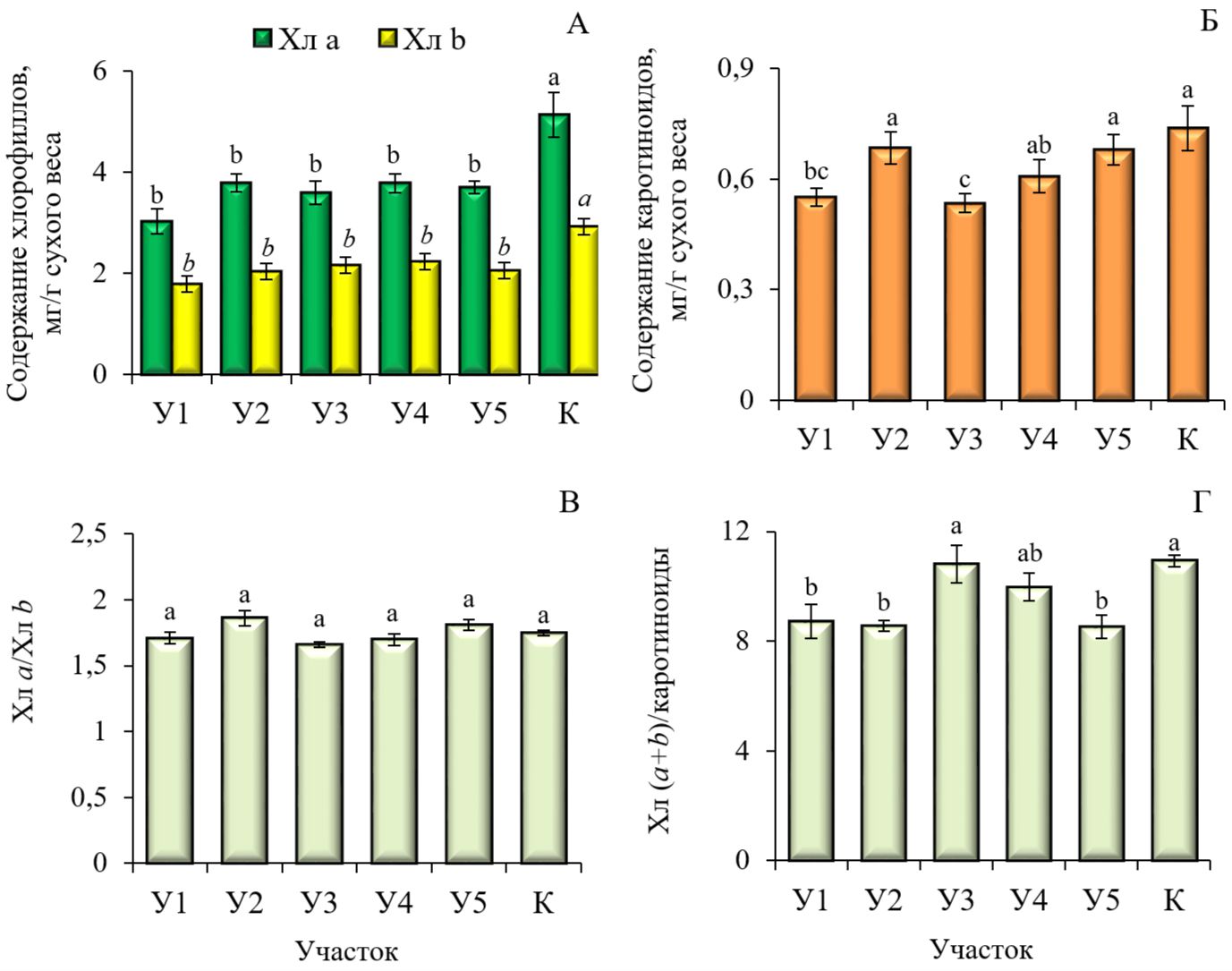 Рис. 2. Содержание (А, Б) и соотношение (В, Г) фотосинтетических пигментов в листьях Betula pendula: У1–У5 – на импактных участках; К – на фоновом участке.