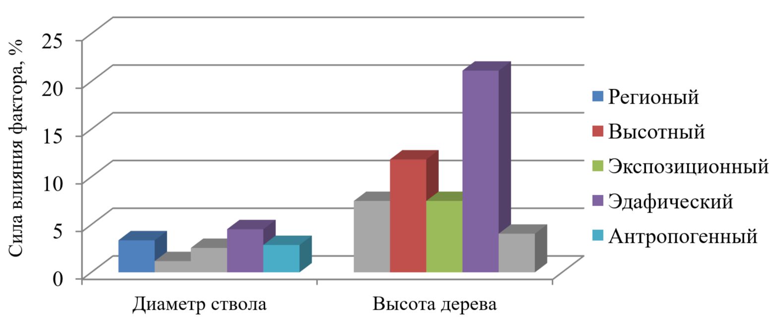В ходе проведенного однофакторного дифференциального анализа установлено, что степень влияния внешних факторов среды на развитие деревьев J. excelsa практически такая же, как и на особи J. deltoides [4]. Максимальное воздействие на диаметр ствола оказывают эдафические условия мест произрастания (степень влияния фактора составляет 4,52 %) (рис. 2). В условиях сухого бора рост деревьев замедляется и диаметр их ствола в среднем составляет 15,00±1,43 см. Тогда как в условиях сухой субори этот показатель в 1,57 раза выше – 23,56±1,97 см.