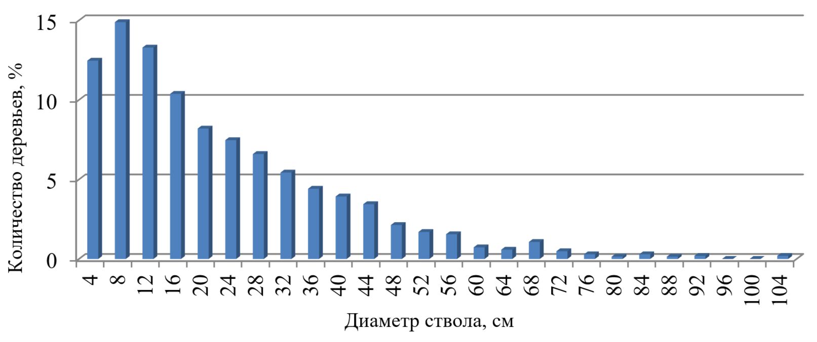 При рассмотрении кривой распределения деревьев по толщине стволов (рис. 3) видно, что она имеет левостороннюю положительную асимметрию с нормальным распределением (асимметричность – 1,20; эксцесс – 0,28).