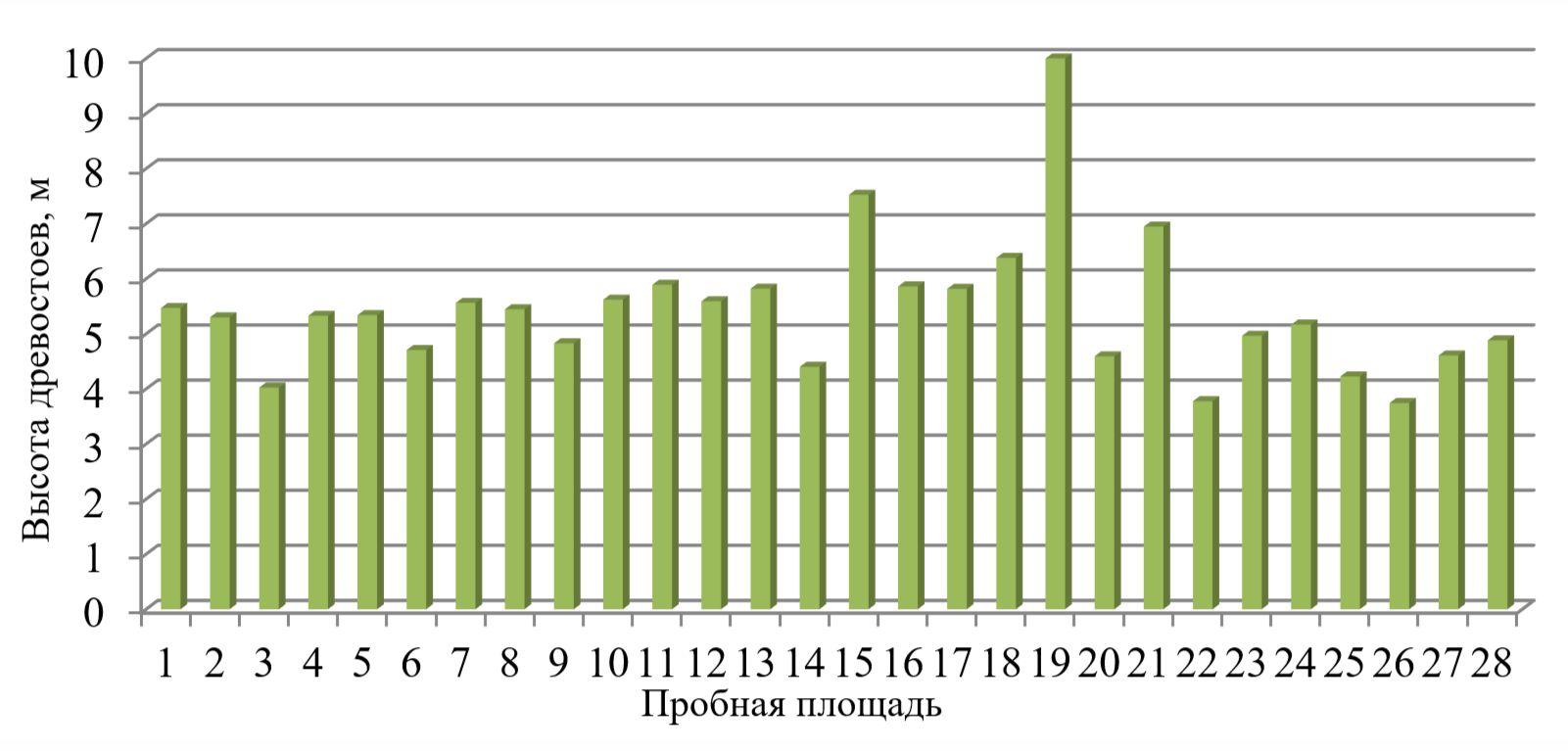 Средняя высота древостоев J. excelsa превышает высоту J. deltoides в 1,67 раза [4] и составляет 5 м. В целом этот показатель варьирует от 4 до 8 м (рис. 4). Коэффициент вариации 20,3 %.