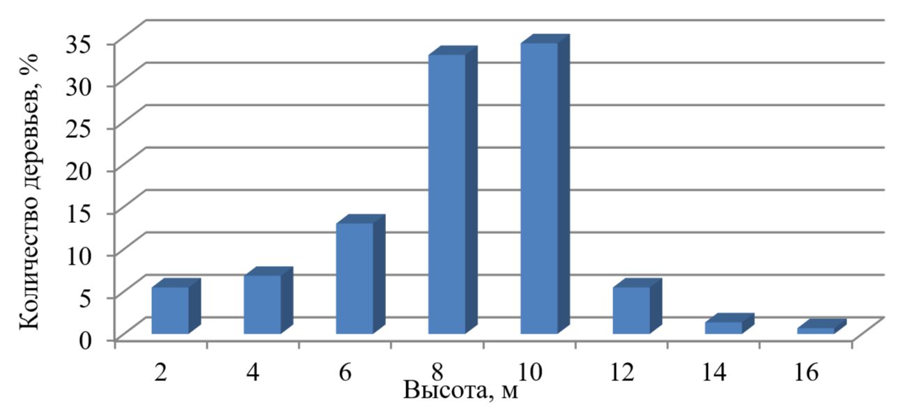 При рассмотрении распределения деревьев J. excelsa по высоте (рис. 5), можно отметить, что кривая также имеет положительную асимметрию, с распределением повышенного косинуса (асимметричность – 0,97; эксцесс – -0,75). Подавляющее большинство деревьев имеет высоту 4–6 м.