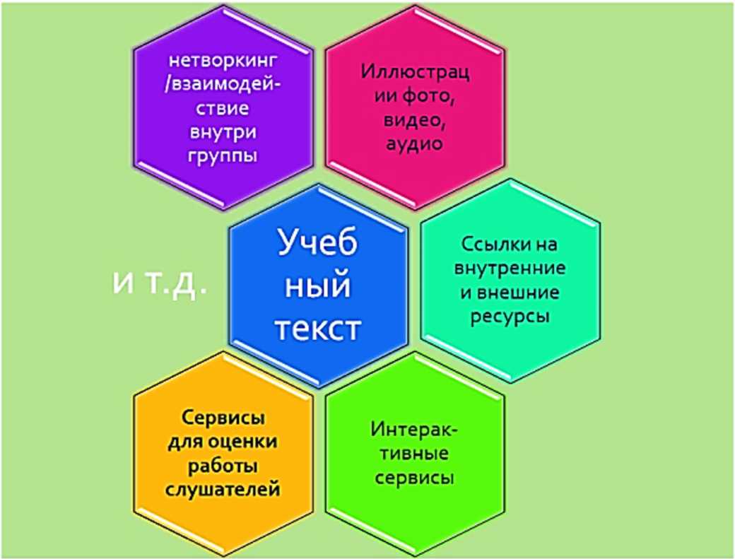 В данной работе под онлайн-курсом понимается система информации, представляющая собой комбинацию учебных модулей, состоящих из различных компонентов. В основе каждого модуля, как правило, лежит учебный текст, на который надстраиваются необходимые ресурсы: иллюстрации, видео- и аудиоматериалы, ссылки на внутренние и внешние ресурсы курса (рис. 1).