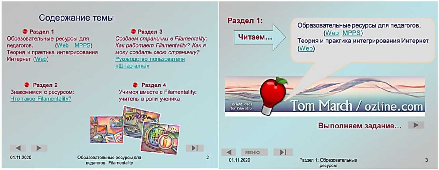 Рис. 3. Пример слайдов из управляемой презентации в PowerPoint: оглавление, управляющие кнопки