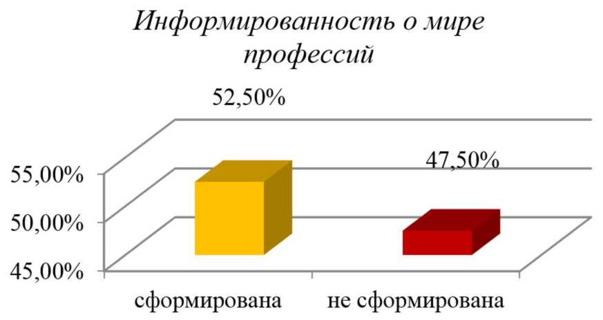 Информированность о мире профессий – это умение соотнести информацию со своими особенностями. В исследовании тестирование показало, что этот критерий сформирован только у 52,5% обучающихся (рис. 2).