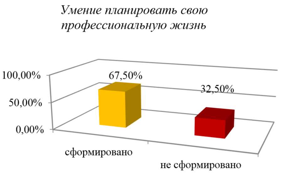 Умение планировать свою профессиональную жизнь – это непрерывный процесс, даже не меняя своего рабочего места, человек всегда развивается – получает дополнительную квалификацию, осваивает новые методы работы, меняет свою роль. Иными словами, человек, находясь в одной из точек профессионального пути, является результатом своего развития в прошлом и предполагает определенное развитие в будущем. Этот критерий сформирован только у 67,5% (рис. 4).