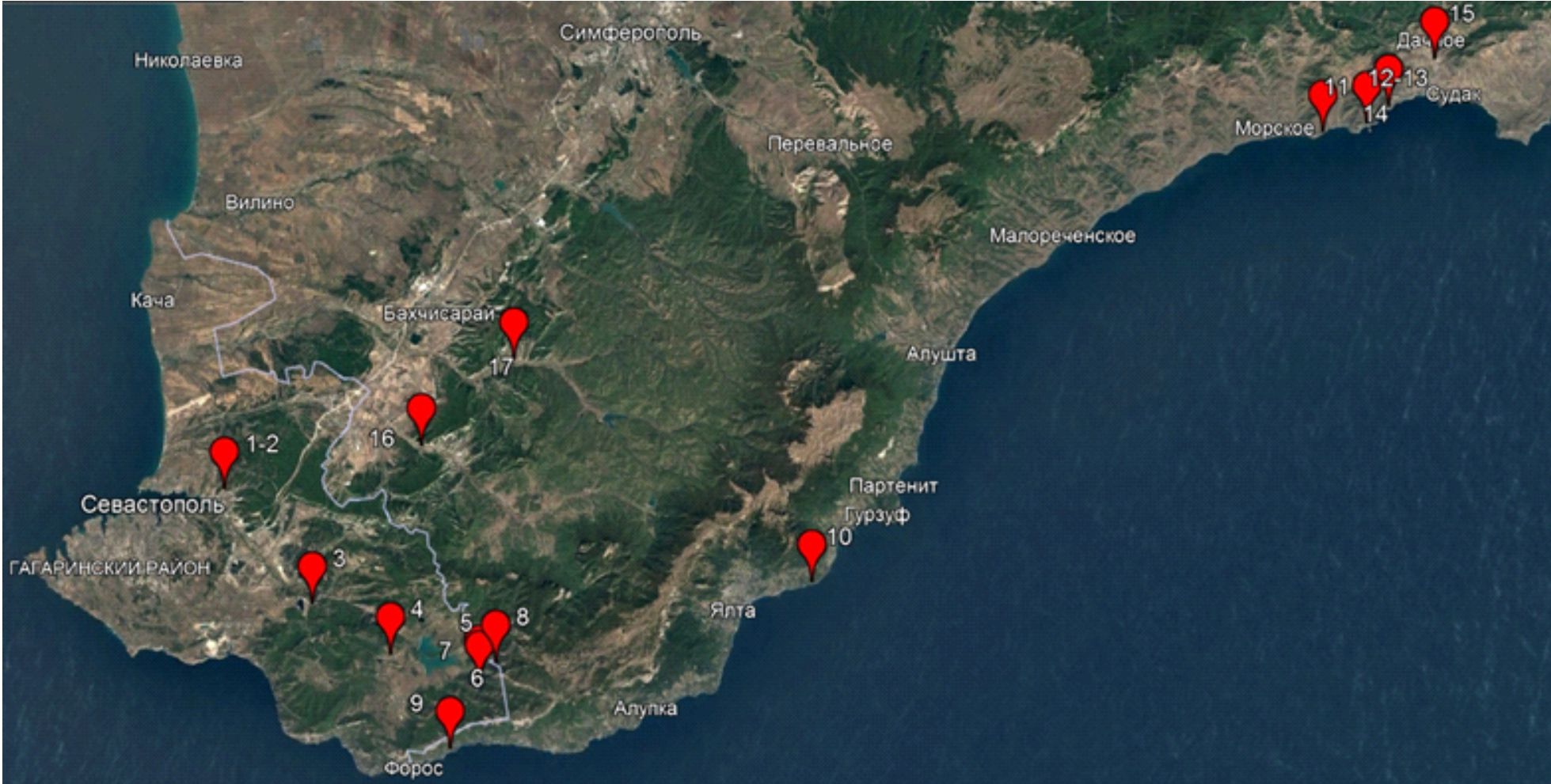 (1–2 – окрестности г. Инкерман; 3 – г. Чирка-Каясы; 4 – г. Самналых; 5 – г. Толака-Баир; 6–8 – г. Кара-Даг; 9 – г. Дракон; 10 – м. Мартьян; 11 – г. Папая-Кая; 12–13 – г. Коба-Кая; 14 – г. Сокол; 15 – г. Каршитерс; 16 – ск. Куллю-Кая; 17 – окрестности с. Кудрино)