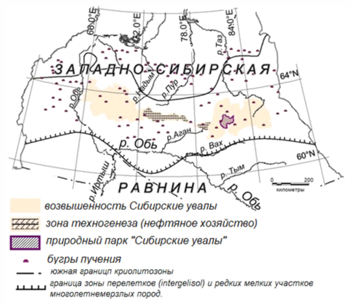 Сибирские увалы сформированы среди чашеобразных заболоченных впадин и простираются от р. Енисей до р. Обь на 1000 км. Абсолютная высота возвышенностей определяется от 90 до 175 м БС. Здесь сформированы уникальные по своей эстетике ландшафты, встречаются виды растений и животных, занесенные в Красную книгу Ханты-Мансийского автономного округа – Югры. Для сохранения уникальности природных объектов в 1998 году была создана особо охраняемая природная территория – природный парк «Сибирские увалы» (далее – ПП).