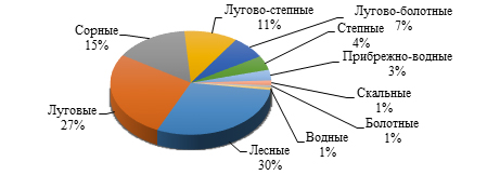Примечание: Ценотические группы: Лесн. – лесные, Луг. – луговые, Степн. – степные, Луг.-степн. – лугово-степные, Луг.-болот. – лугово-болотные, Прибр.-водн. – прибрежно-водные, Скальн. – скальные, Болот. – болотные, Водн. – водные, Сорн. – сорные