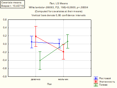 При оценке таких ковариантов, как возраст и пол, наблюдается корреляция кластера в основном длиннотных величин по F1 (ростовой) с возрастом, по F2 (упитанность) с полом. Параметры, оценивающие изменения мозгового и лицевого черепа, такие, как ширина лица, окружность головы и межорбитально-окружностный индекс, коррелируют как с полом, так и с возрастом.