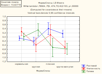 На рисунке 2 приведены результаты дисперсионного анализа по группам с нарушением осанки. Некоторые результаты можно обосновать с точки зрения биомеханики (например, у детей с плоской и кругло-вогнутой спиной рост выше). Неясно, чем объяснить значимо низкие величины компонента упитанности у детей с круглой и кругло-вогнутой формой спины. Окружность головы, ширина лица и межорбитально-окружностный индекс также значимо ниже у детей с НДСТ при формировании у них круглой и кругло-вогнутой спины.