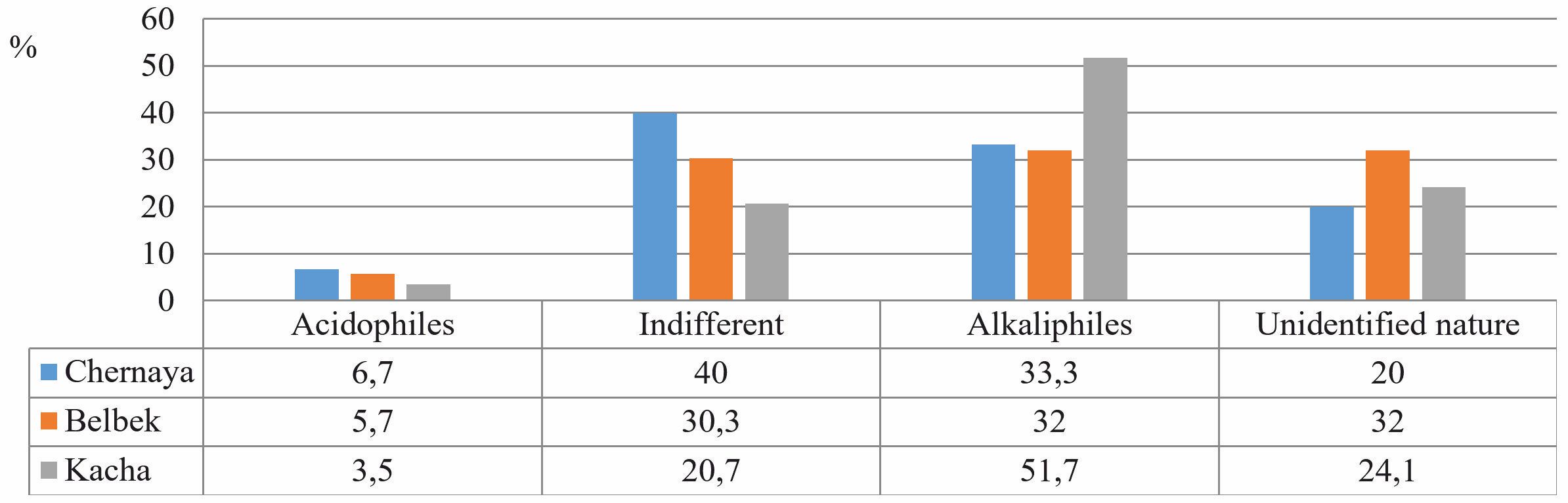 The share of acidophiles in rivers varies from 3.5% (Kacha) to 6.7% (Chernaya). This group is represented by only five diatoms: Meridion circulare (Greville) C. Agardh, Denticula thermalis Kützing, Eunotia faba (Ehrenberg) Grunow, E.minor (Kützing) Grunow, Gomphonema acuminatum Ehrenberger, the occurrence of which did not exceed two points. Thus, for the listed species, the vegetation period is below average.