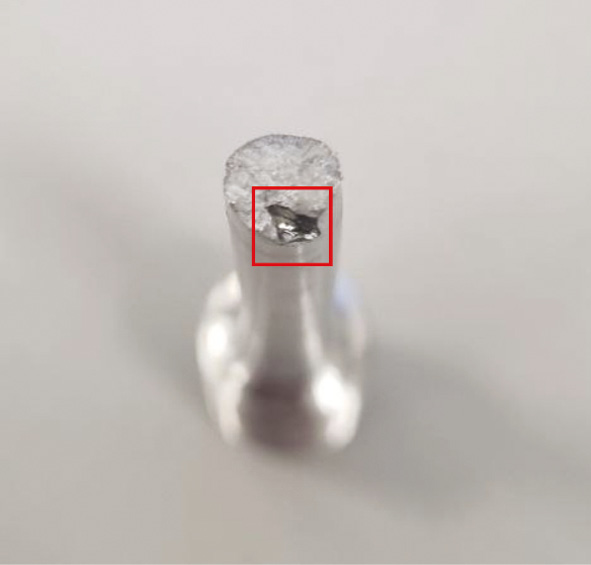 Также стандартные значения свойств были достигнуты в направлении оси Х при стратегии с линейными колебаниями под углом 45 градусов относительно направления выращивания. На одном из образцов, испытанных в направлении оси Z, после испытаний был обнаружен крупный дефект, что существенно снизило значения свойств (рис. 6). Поэтому данный образец был убран из рассмотрения.