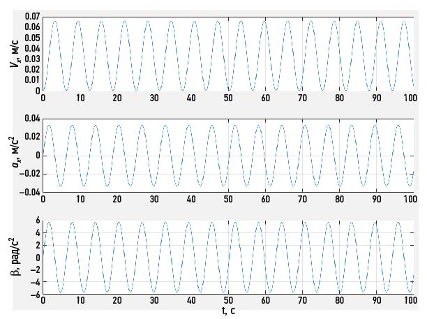 Как видим из рис. 4, при разомкнутом управлении координата манипулятора изменяется по близкому к линейному закону. Рассмотрим изменение во времени скорости, линейного и углового ускорения вдоль рабочей оси (рис. 5).