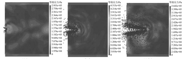 Как следует из названия, SPH широко применяется в вычислительной гидродинамике, однако в настоящее время активно ведутся работы по адаптации метода для МДТТ, в первую очередь применительно к задачам хрупкого разрушения [11, 12]. Метод позволяет моделировать развитые деформации и разрушения среды путем разделения скопления частиц. В [13] представлены решения задач хрупкого разрушения образцов льда при изгибе и сжатии, а также выполнено прогрессирующее разрушение ледяной балки о препятствие и разрушение равномерного ледяного покрова при прохождении судна с разными скоростями (без учета водной среды). В работе [14] выполнено численное моделирование взаимодействия цилиндрической колонны (гладкой, с цилиндрическими и кольцевой наделками) с ровным ледовым полем в SPH-постановке (см. рис 4).