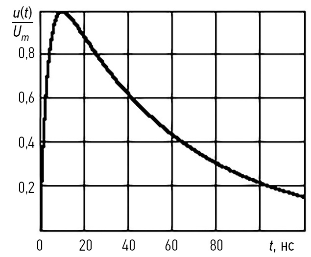 Для получения длительности фронта 5 нс, длительности импульса 50 нс и единичной амплитуды импульса Um = 1 по ГОСТ IEC 61000-4-4-2016 следует положить E = 1,261, τ1 = 3,3 ∙ 10-9 с, τ2 = 56 ∙ 10-9 с.