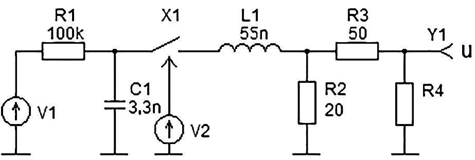 Генератор микросекундных импульсных помех длительностью 50 мкс по ГОСТ IEC 61000-4-5-2017 моделируется схемой, представленной на рис. 3.