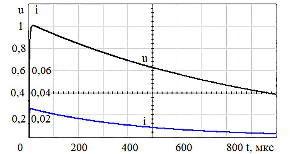 Рис. 6. Изменение напряжения u на выходе модели генератора импульсов 700 мкс по IEC 61000-4-5 на холостом ходу и тока i при коротком замыкании выхода.