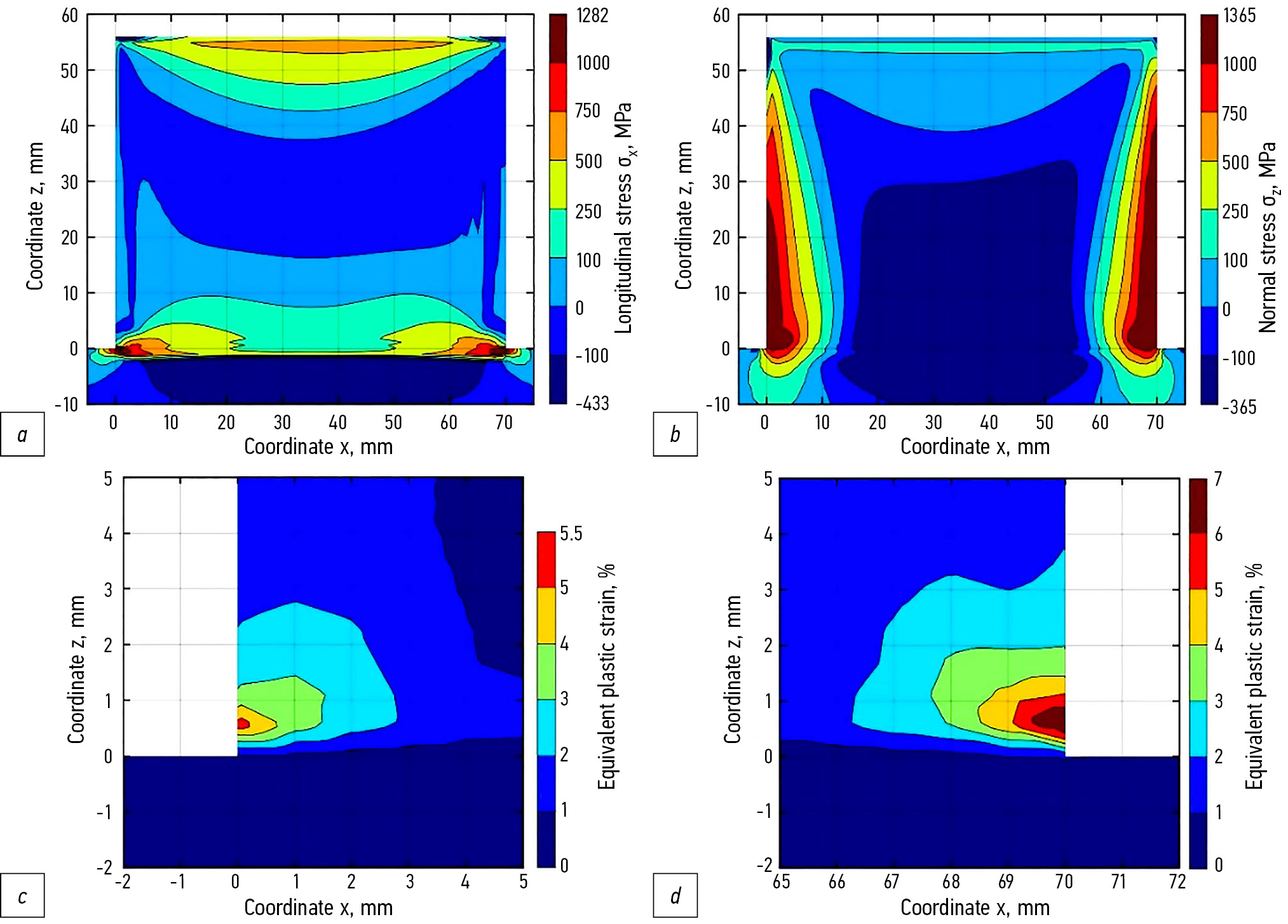 Рис. 3. Поля остаточных продольных (a) и нормальных (b) напряжений, накопленных пластических деформаций (c, d) в наплавке из сплава Ti-6Al-4V без галтелей.