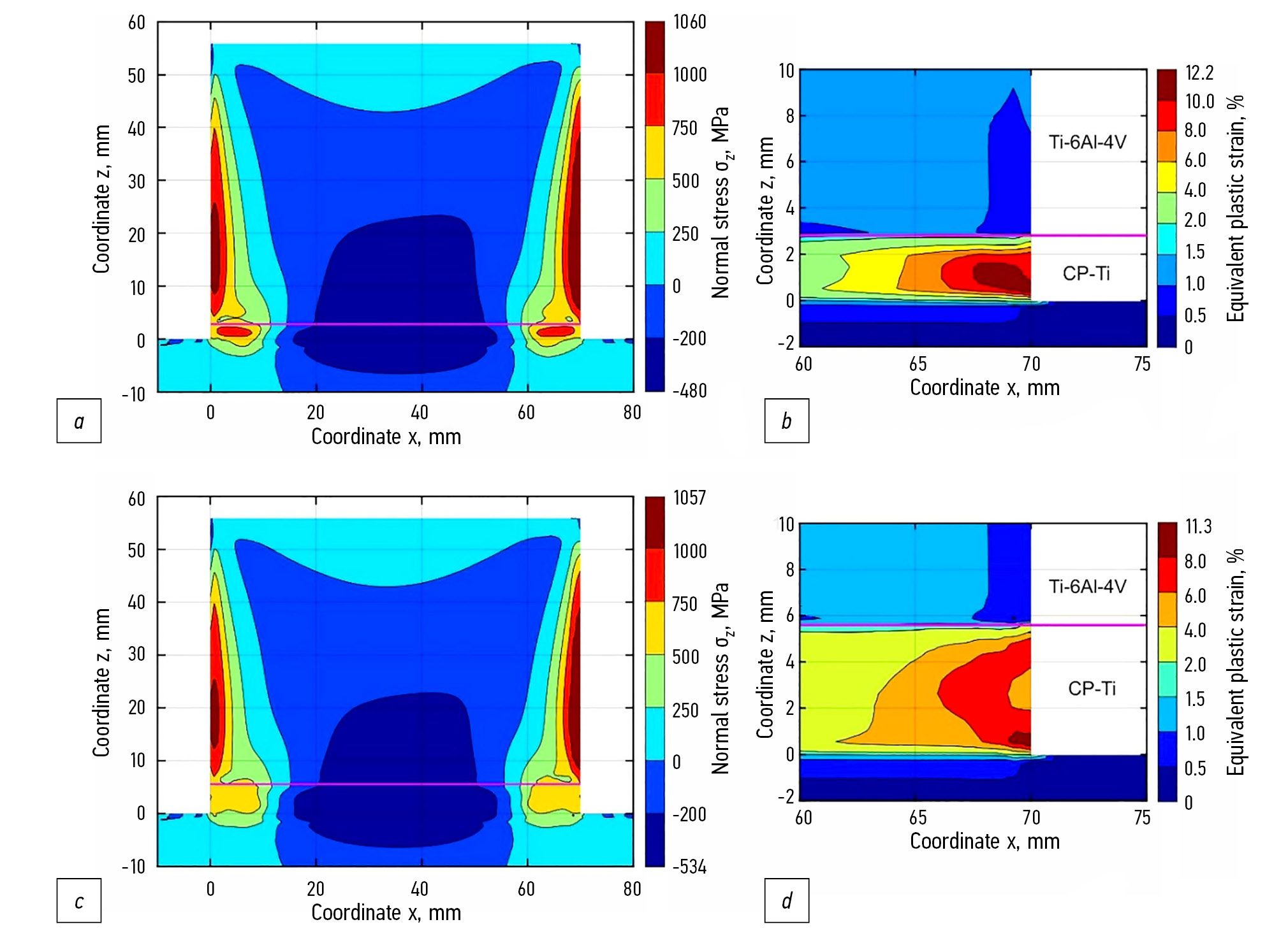 Рис. 6. Поля остаточных нормальных напряжений (а, с) и накопленных пластических деформаций (b, d) в наплавке с первыми 5 (a, b) и 10 (c, d) слоями из чистого титана.