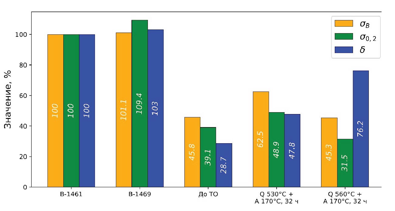 На рис. 2 представлены результаты механических испытаний сварных соединений до ТО, а также после ТО с двумя разными температурами закалки. Значения нормированы на значения соответствующих показателей сплава В-1461, абсолютные значения которых составляли: σВ = 550 МПа, σ0,2 = 470 МПа, δ = 10,1 %. Результаты испытаний показали, что более высокая температура закалки позволяет сделать материал шва более пластичным в результате старения. В то же время более низкая температура закалки позволила получить более высокие прочностные показатели. Поскольку прочностные показатели являются более значимыми для сварных соединений, температура закалки 530 °C была принята как оптимальная в данном исследовании. Микроструктурные и рентгенофазовые исследования, описанные в последующих главах, будут относиться к сварному соединению, обработанному по этому режиму ТО.
