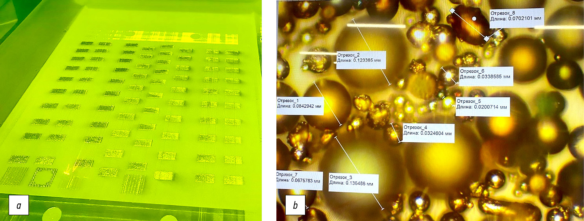 Fig. 3. View of the platform (а) and powder particles removed from the melt bath after exposure to laser radiation (b).